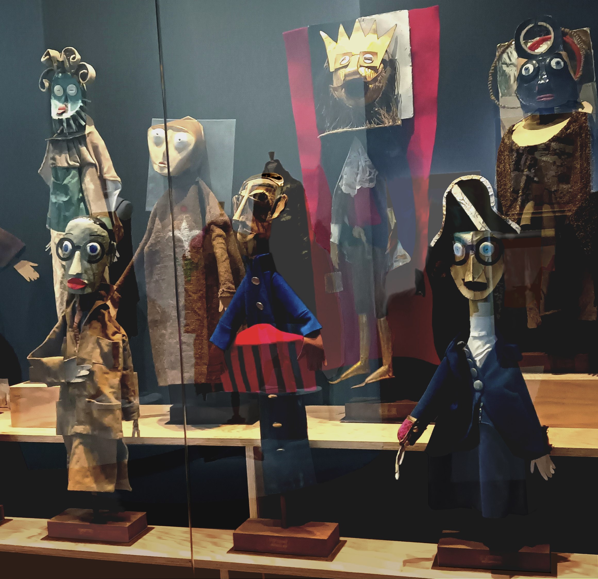 Parmi ces nouveaux objets assez uniques et assez extraordinaires, évoquons les marionnettes de Marie Vassilieff et de Sophie Taeuber-Arp. Les marionnettes imaginées par Marie Vassilieff pour un spectacle de théâtre reprennent certaines inspirations issues de l’art des masques, très à la mode à l’époque. Elles possèdent aussi cette capacité de « refigurer » des portraits. Elles deviennent un objet culte dans le Paris de l’époque. Beaucoup de personnages importants lui demandent ces portraits poupées, Le Corbusier et Joséphine Baker par exemple.