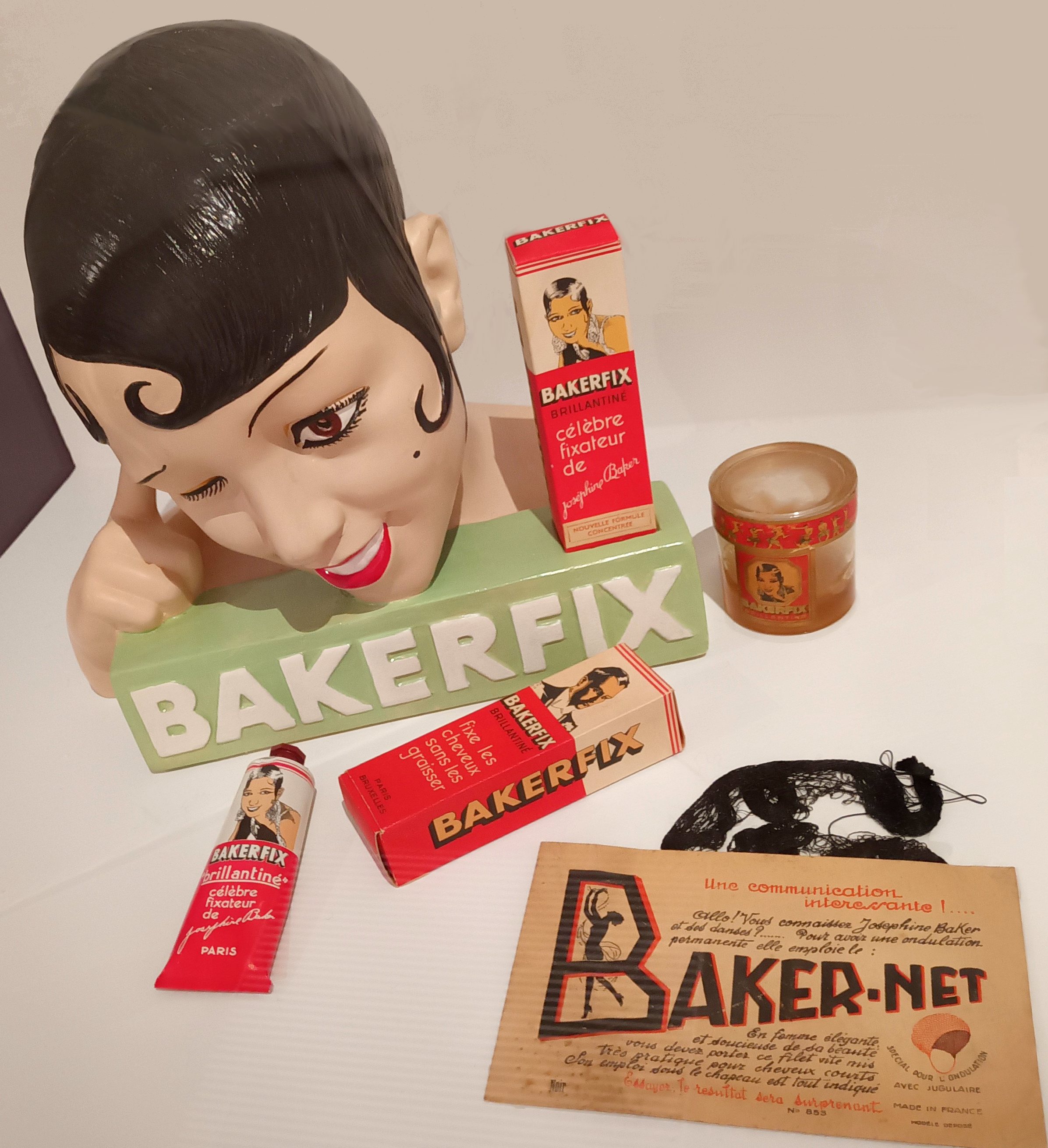 On ne pouvait pas ne pas mentionner Joséphine Baker, mais un peu comme pour Sonia Delaunay, les commissaires de l’exposition ont choisi de la montrer de manière un peu différente. Auto-entrepreneuse avant l’heure, elle était l’artiste la mieux payée d’Europe. Elle a compris que son image se vendait très bien. Elle arrive des États-Unis. Son personnage, son physique, la musique qu’elle amène, la couleur de peau, tout symbolise la nouveauté pour l’Europe, pour Paris. Elle décide de produire toute une série de produits dérivés liés à son image : BAKERFIX, BAKEROIL et BAKER-NET. S’ils voulaient lui ressembler, les hommes et les femmes pouvaient se coiffer à sa manière en utilisant BAKERFIX. Adopter BAKER-NET leur permettait, à l’instar de l’artiste, de bien faire tenir leurs cheveux, et ils pouvaient bronzer avec BAKEROIL, la première huile de bronzage. Elle fait de la publicité pour des événements sportifs ou des vêtements de sport. Elle est prise en photo par Madame d’Ora.