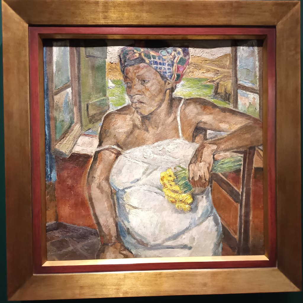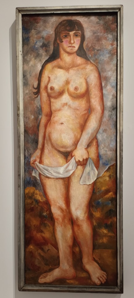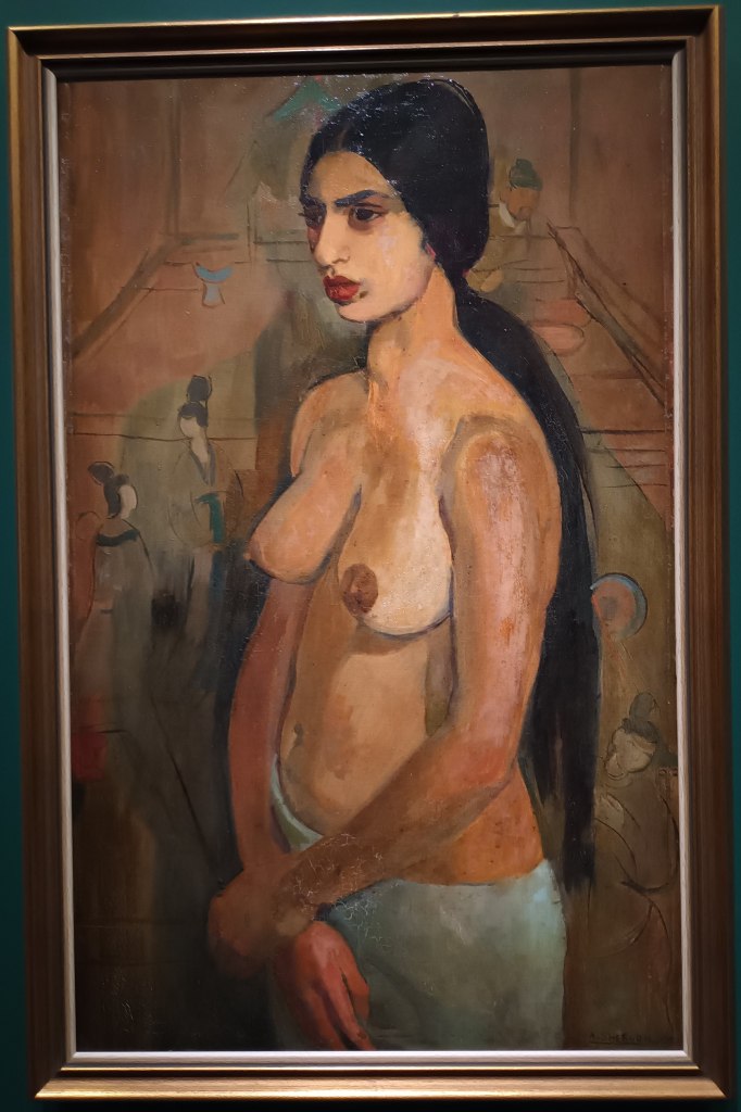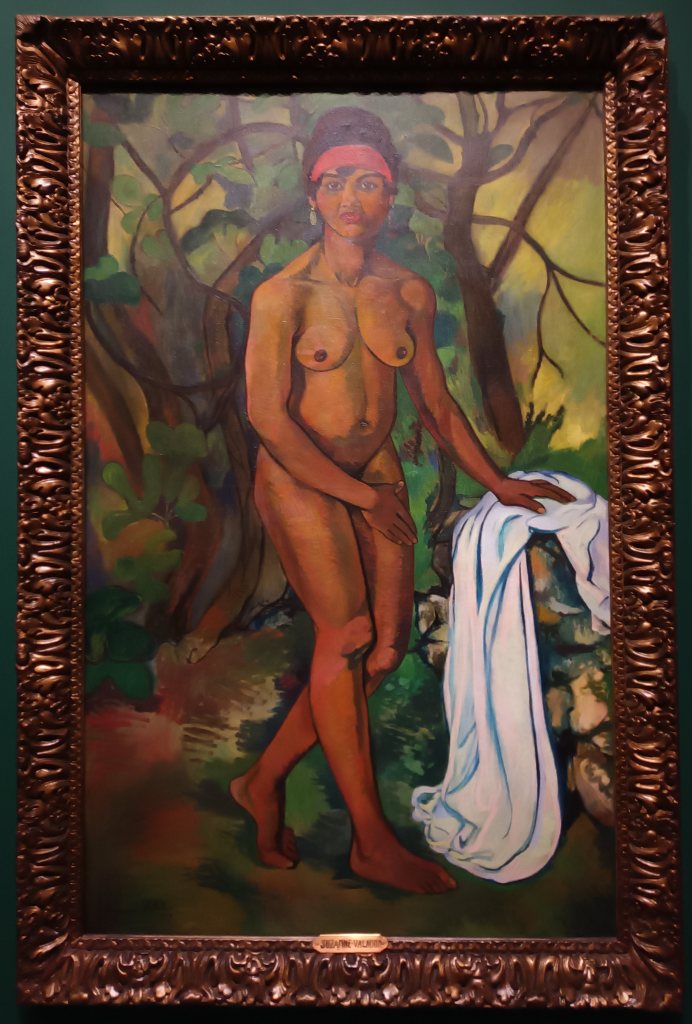 A côté des œuvres de Tarsila Do Amoral, figure « l’autoportrait en tahitienne » de Amrita Sher-Gil, une artiste indienne. La démarche est similaire à celle de l’artiste brésilienne. Elle arrive à Paris, s’y forme. Rentrée en Inde, elle se dit : « Je veux devenir la Picasso d’Inde ». Un peu comme Suzanne Valadon, elle s’approprie la tradition tout en la réinterprétant à sa manière. Elle revisite Paul Gauguin. Les décors sont un peu japonais et peuvent rappeler certaines toiles de Van Gogh, ou ce portrait de Paula Modersohn Becker connu pour être le premier autoportrait nu d’une femme enceinte.