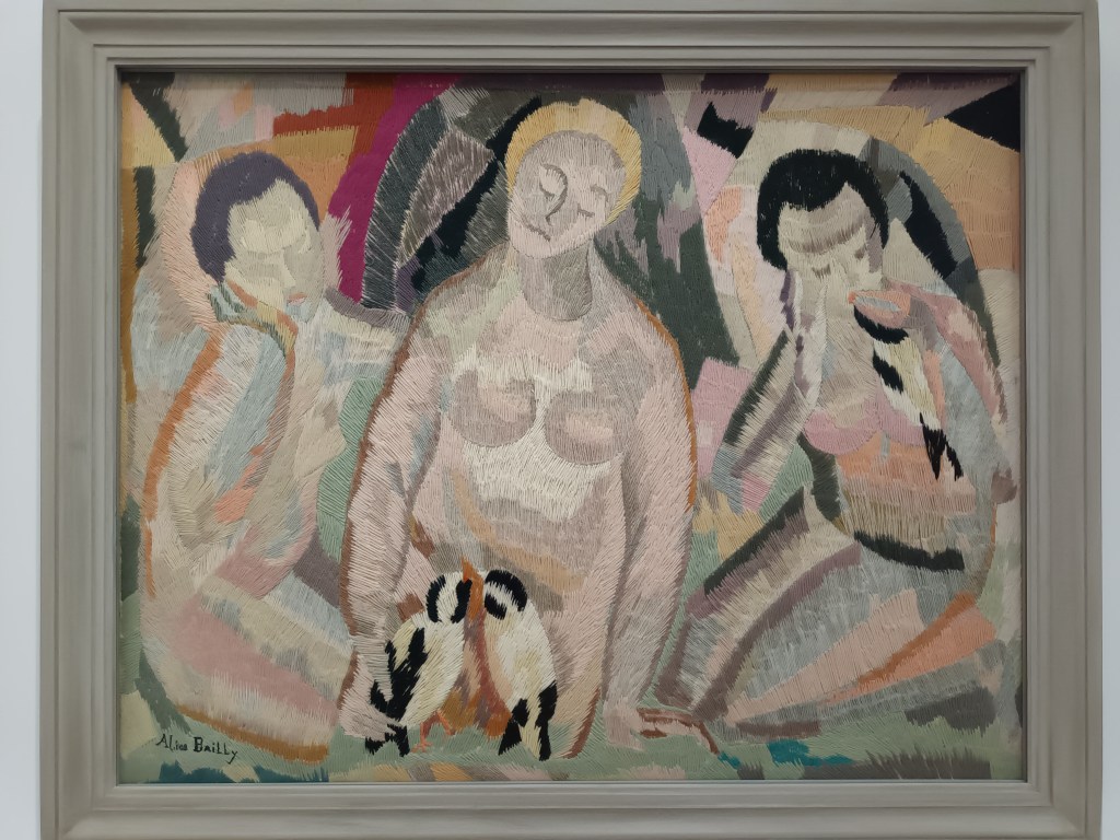 Le tableau de Juliette Roche, cette danse, une reprise de l’oeuvre de Matisse, résume un peu cette décennie. Cette grande toile – c’est assez nouveau – symbolise cette période dorée, cette brèche entre la Première et la Deuxième Guerre mondiale, et cette utopie probablement aussi d’un monde où hommes et femmes pourraient vivre ensemble. Ce déjeuner sur l’herbe moderne, avec trois couleurs de peau qui dialoguent, qui parlent en amitié. L’artiste qui nous regarde pour revenir à la tradition ancienne, avec peut-être son amante.