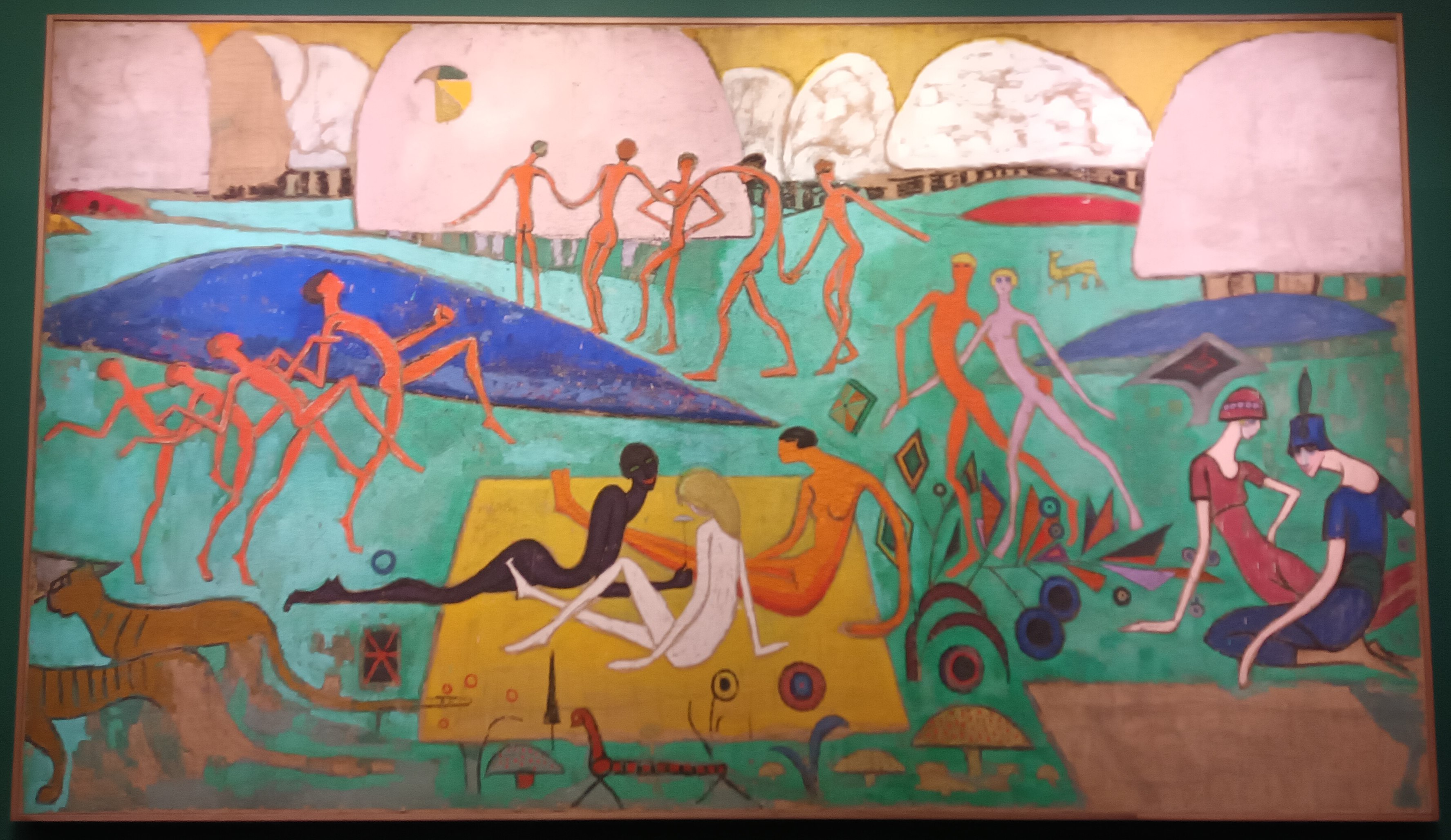 Les pionnières de la diversité sont des artistes qui viennent à Paris, qui s’y forment et qui, une fois rentrées chez elle, contribuent à la diffusion d’un nouveau langage, tout en gardant certains aspects propres à leur pays. L’exemple en est Tarsila Do Amoral. Elle a été formée à l’Académie de Fernand Léger, dont on peut reconnaître certains volumes, mais les couleurs sont celles vraiment baroques des villes brésiliennes, et les paysages, la nature, les animaux sont propres à sa culture. Elle fonde un mouvement qui s’appelle l’anthropophagie. Elle joue un rôle très important chez elle. C’est une icône, une star au Brésil. Le dessin Abaporu qui, en langue guarani signifie cannibale, est un peu son autoportrait. Elle a voyagé, s’est nourrie de différentes influences, du langage de la modernité. Elle a digéré tout cela et créé son propre langage.