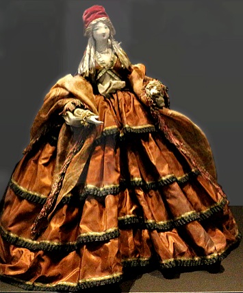 Stefania Lazarska, Poupée vêtue d’une robe de style Second Empire de couleur chocolat, à galon noir et fleuri, d’un châle dit « des Indes » à motifs cachemire, d’un spencer assorti, d’un bonnet à pompon rouge dit « à la turque », d’un jupon et d’un pantalon brodés, 1931 © humanitelles