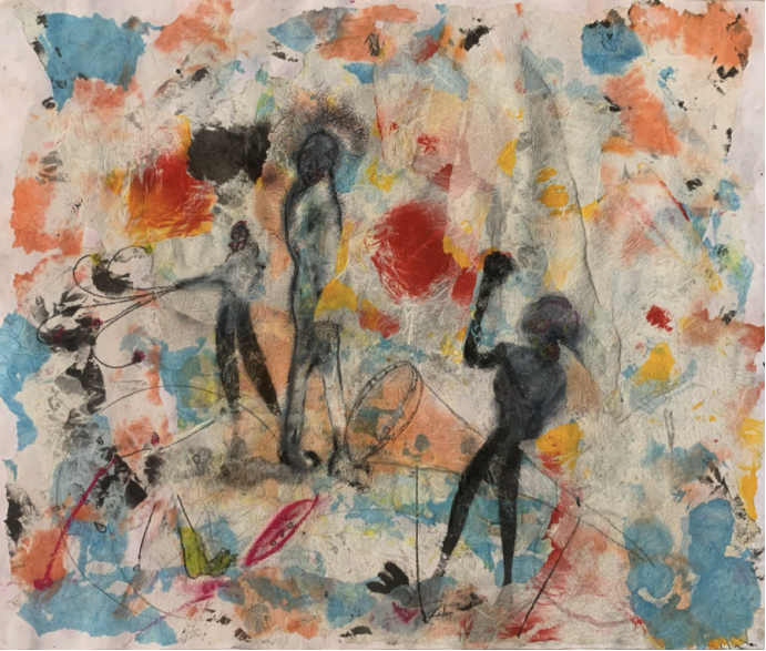 Poursuivons par Obodjé, né en 1992 à Agboville en Côte d’Ivoire. C’est un artiste autodidacte qui vit et travaille à Abidjan. Les formes et les signes développés par Obodjé sont indemnes d’influences issues de la traduction artistique ou de références académiques. « Né dans un village en lisière de forêt, dit-il, j’aimais écouter la parole des anciens. Lors de mes promenades naissaient de nouveaux paysages subjectifs. La peinture est un moyen de me connecter aux liens sacrés qui me lient à mes ancêtres. »
