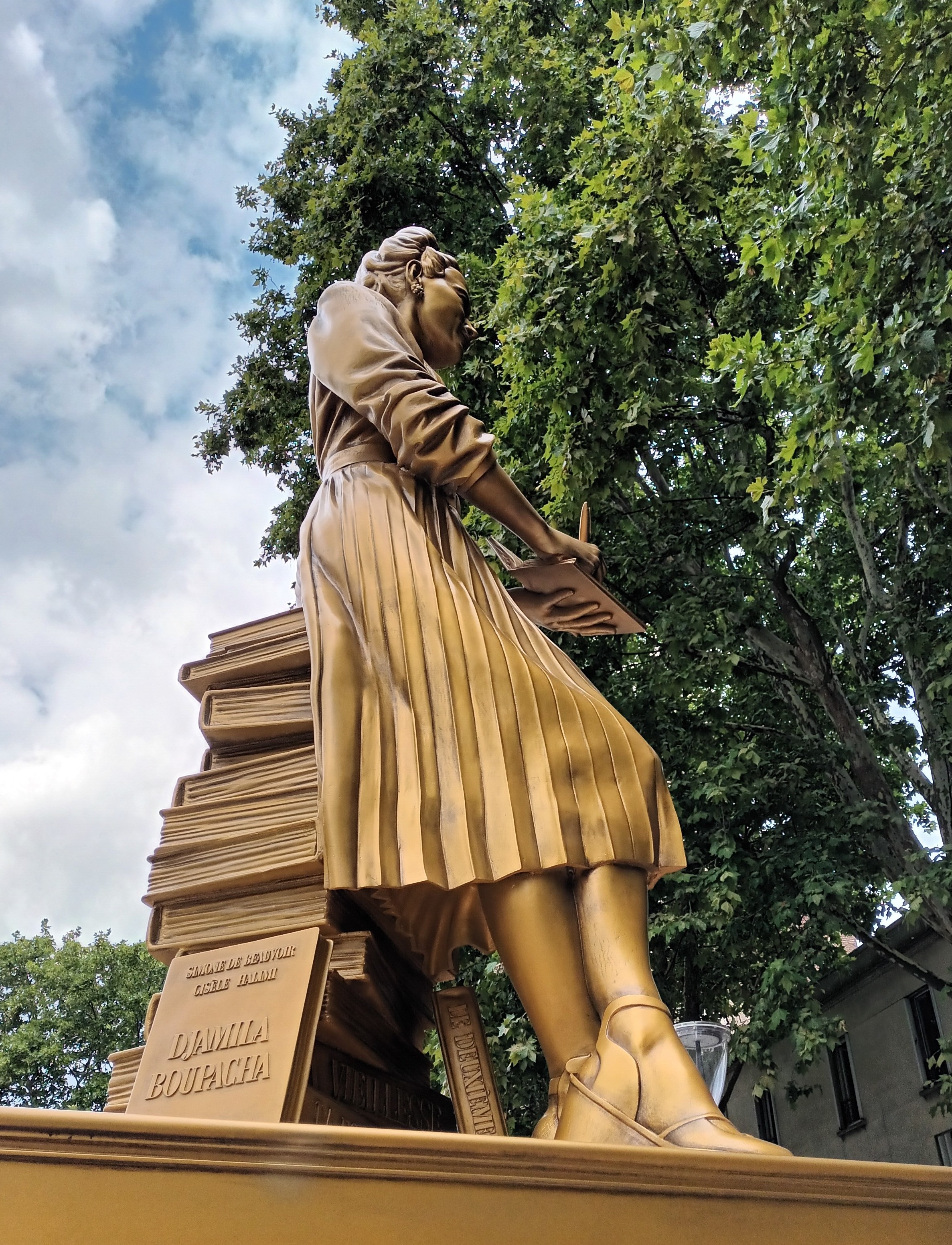 Démarre alors la sixième séquence de la cérémonie d’ouverture, Sororité, qui met en lumière dix femmes françaises, pionnières chacune dans leur domaine. Une manière de rendre hommage à toutes les femmes, matérialisées par des statues dorées en pied parées d’objets emblématiques (pavés de barricade, discours, matériel de botaniste, pile d’ouvrages de l’autrice, etc.) qui émergent de piliers disposés le long des quais de la Seine : Olympe de Gouges, Alice Milliat, Gisèle Halimi, Paulette Nardal, Jeanne Barret, Christine de Pizan, Louise Michel, Alice Guy, Simone Veil et Simone de Beauvoir.